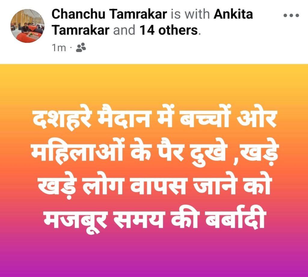 ऐसे में आयोजकों ने 7 बजे रावण दहन की जगह 8 बजे कार्तिकेय चौहान के द्वारा रावण दहन करवाया ।जिससे काफी देर तक परेशान होने के बाद कई लोग बिना रावण दहन देखे अपने बच्चों के साथ वापस लौट गए और आयोजकों को जमकर कोस रहे हैं कि धार्मिक आयोजन को राजनीति की भेंट चढ़ाना कितना उचित है..?