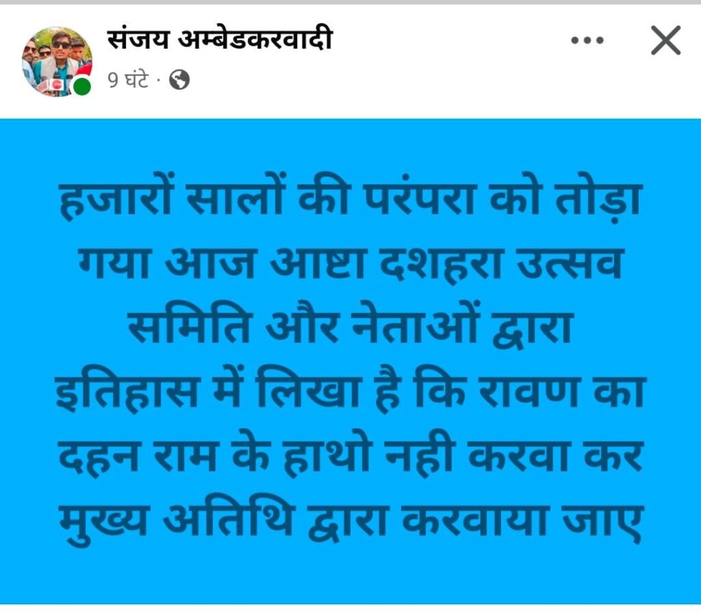 इसलिए सम्पूर्ण भारत वर्ष में यह दशहरा का पावन और पवित्र पर्व बड़े ही धूमधाम और हर्ष उल्लास के साथ मनाया जाता है और यही परंपरा आष्टा में भी वर्षो से चली आ रही है लेकिन इस वर्ष स्वयं की वाहवाही के चक्कर में दशहरे पर चली आ रही परंपराओ को न बल्कि तोड़ा गया बल्कि एक धार्मिक आयोजन को राजनीति की भेंट चढ़ाने से भी आयोजक नहीं चुके!.