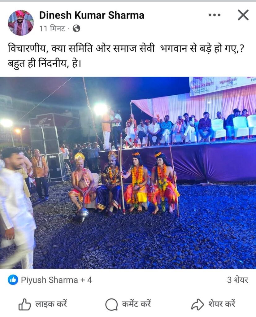 आपको बता दें की इस दशहरे पर पब्लिक का गुस्सा सोशल मीडिया पर खूब फूट रहा है जिसका सबसे बड़ा कारण एक अच्छे खासे धार्मिक आयोजन को स्वयं की महत्वाकांक्षी अति लालसा के चलते राजनीति की भेंट चढ़ा देना नजर आया। लाजमी है ऐसे हालत में इस दशहरा पर आयोजन समिति और धर्म के ठेकेदारों द्वारा कई बड़ी गलतियां या कहे चूक नजर आई जिससे सनातन प्रेमी सोशल मीडिया पर लिखने से नहीं नहीं चूक रहे हैं गौरतलब है कि दशहरे के चल समारोह में आकृषण का केंद्र रहने वाले प्रभु श्री राम स्वयं अपने ही विजयी जुलुस(शोभायात्रा) में विशेष बग्गी या विशेष साज सज्जा से सुसज्जित रथ में बैठे होने की बजाय बिना साज सज्जा के एक छोटे से साधारण बग्गी संग लक्ष्मण और हनुमान के साथ बैठे हुए थे। जो काफी तकलीफ और पीड़ा दायक था क्योंकि पूरी शोभायात्रा के केंद्र बिंदु आकर्षण श्री राम, सीता मैय्या, श्री लक्ष्मण, हनुमान जी होते हैं ऐसे में इनकी बग्गी को ही दरकिनार कर अन्य बेवजह की चीजों पर ध्यान देना कहीं न कहीं एक बड़ी चूक कहा जा रहा है जो इस शोभायात्रा को फीका कर रहा था । वही दूसरी और दशहरा मैदान की एक फोटो भी सोशल मीडिया पर वायरल हो रही है जिसमें श्री राम और लक्ष्मण जी मुख्य मंच के सामने जमीन पर लगी कुर्सियों पर बैठे नजर आए तो शहर के प्रभावशाली लोग मंच पर ठाठ से बैठे नजर आए जिससे सनातन धर्म को मानने वाले लोग और भड़क गए हैं और सोशल मीडिया जमकर भड़ास निकाल रहे हैं।