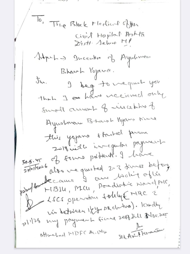 आयुष्मान योजना की प्रोत्साहन राशि में हुए घोटाले के सामने आने के 20 दिनों बाद भी जिला प्रशासन या स्वास्थ विभाग ने अब तक भ्रष्ट आरोपियों पर एफआईआर दर्ज नहीं करवाई नाही शासकीय सेवा से बर्खास्त किया है ऐसे में अब आष्टा से भोपाल तक पहुंचे मामले के बाद जिले का स्वास्थ विभाग सिर्फ जांच के नाम पर खानापूर्ति करने में जुट गया है आपको बता दें की आयुष्मान योजना के इनसेंटिव की शिकायत सेवा निवृत शिशुरोग विशेषज्ञ डॉक्टर एके जैन ने 27 जनवरी को लिखित में स्थानीय बीएमओ को दर्ज कराई थी। इसके बाद बीएमओ अमित माथुर ने 31 जनवरी को आनन फानन में जिला स्वास्थ विभाग को पत्र लिखकर अवगत कराया।