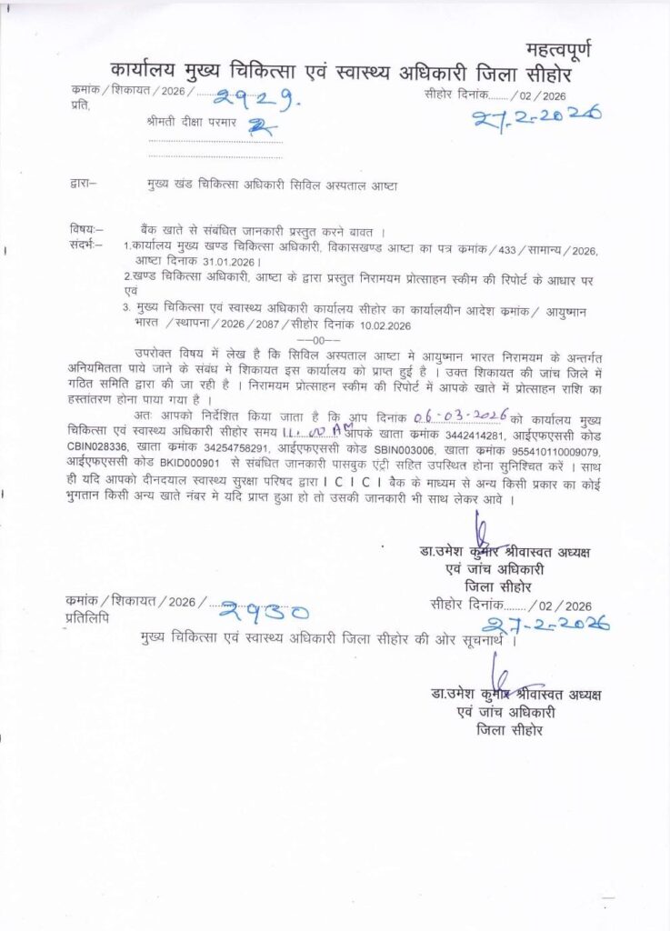 आयुष्मान विभाग के निर्देश पर मुख्य चिकित्सा एवं स्वास्थ्य अधिकारी सुधीर डहरिया द्वारा गठित 6 सदस्यीय जांच टीम को लीड कर रहे जांच कर्ता सिविल सर्जन डॉक्टर उमेश श्रीवास्तव ने उन सभी खाता धारकों को नोटिस देकर तलब किया है जिनके खातों में पात्र लाभार्थियों की जगह अपात्र व्यक्तियों के बैंक खातों में 46 लाख रुपए से अधिक की आयुष्मान योजना की प्रोत्साहन को ट्रांसफर कर डाला है। लिहाजा इन सभी अपात्र खाता धारकों को 6 मार्च को 11 बजे उपस्थित होकर बैंक खातों का स्टेटमेंट उपलब्ध कराने के आदेश पत्र जारी किए गए हैं जिन्हें जांच दल द्वारा नोटिस देकर तलब किया गया है उनमें मुख्य रूप से स्टोर इंचार्ज प्रमोद परमार, तत्कालीन आयुष्मान मित्र जगदीश मेवाड़ा, दीक्षा परमार, कांता परमार, बबीता परमार,स्मिता सोलंकी,सागर मेवाड़ा सहित सीहोर के संजीवनी क्लिनिक में पदस्थ डॉक्टर शुभम परमार भी शामिल है।