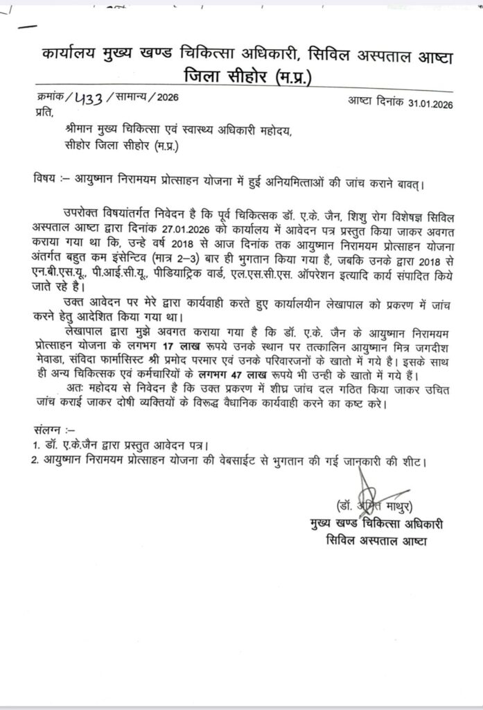 आपको बता दें की आयुष्मान योजना के इनसेंटिव की शिकायत सेवा निवृत शिशुरोग विशेषज्ञ डॉक्टर एके जैन ने 27 जनवरी को लिखित में स्थानीय बीएमओ को दर्ज कराई थी। इसके बाद बीएमओ अमित माथुर ने 31 जनवरी को आनन फानन में जिला स्वास्थ विभाग को पत्र लिखकर अवगत कराया।