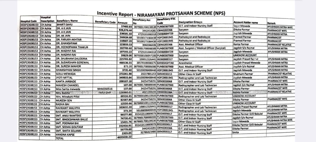 आपको बता दें कि आयुष्मान योजना इनसेंटिव की 46 लाख रुपए की राशि प्रमोद परमार, जगदीश मेवाड़ा ने अपने बैंक खातों सहित अपने करीबी रिश्तेदारों जिनमें दीक्षा परमार, कांता परमार, बबीता परमार, शुभम परमार, सागर मेवाड़ा के बैंक खातों में ट्रांसफर कर डाली थी।