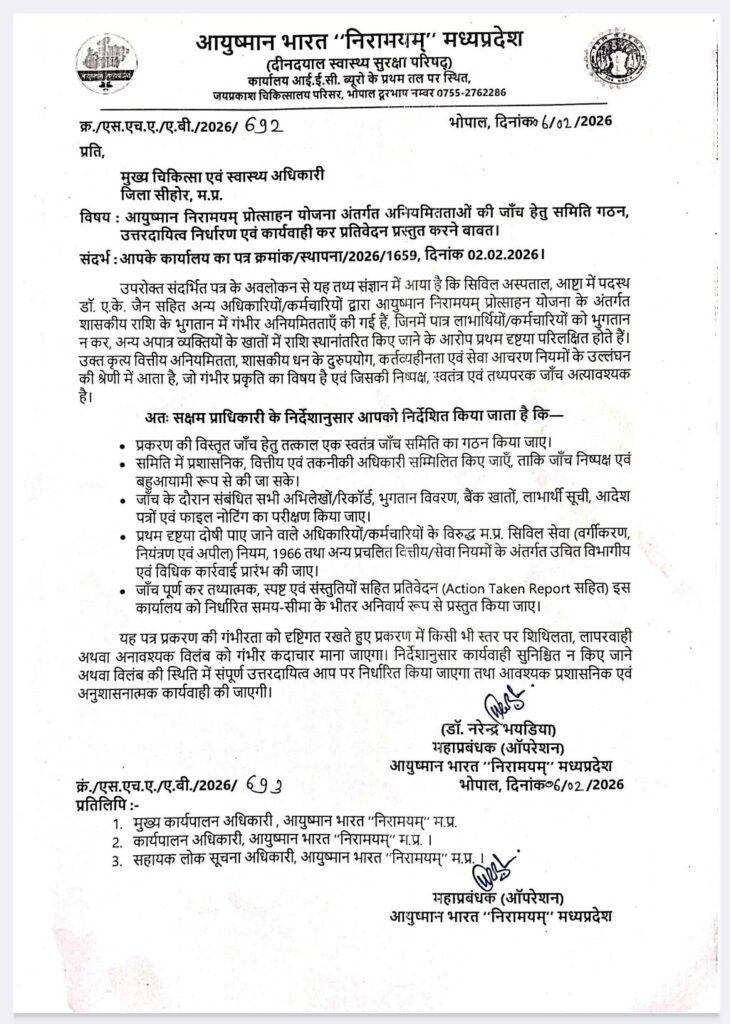जिसके बाद 2 फरवरी को मुख्य चिकित्सा एवं स्वास्थ्य अधिकारी सुधीर डहरिया ने आयुष्मान भारत नीरामयम विभाग भोपाल को पत्र लिखा, इसके बाद 6 फरवरी को आयुष्मान भारत नीरामयम विभाग भोपाल के महाप्रबंधक डॉक्टर नरेंद्र भयडीया ने सीहोर स्वास्थ विभाग को जांच के आदेश जारी किए , ऐसे में आयुष्मान भारत नीरामयम विभाग भोपाल से आदेश जारी होते ही जिला स्वास्थ विभाग ने भी जोहमत उठाते हुए 10 फरवरी को 6 सदस्यीय जांच टीम गठित करने के आदेश जारी किए। लिहाजा मुख्य चिकित्सा एवं स्वास्थ्य अधिकारी द्वारा गठित जांच टीम ने 13 फरवरी को सिविल सर्जन डॉक्टर उमेश श्रीवास्तव के नेतृत्व में जांच का खेल शुरू कर दिया।